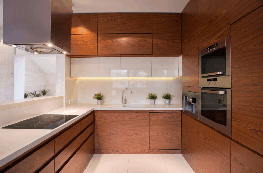 Pairing wood with matte black, gold, or brushed nickel hardware gives your kitchen a modern, elegant finish.